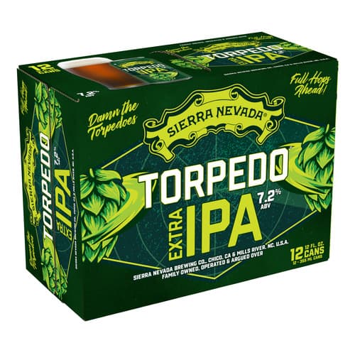 A craft beer as bold as it is innovative Sierra Nevada Torpedo Extra IPA is an India Pale Ale that delivers on big hops without sacrificing on rich flavor. At 7.2% ABV this craft beer lover's IPA is made from a variety of hops and carmelized malts dry hopped to perfection in the Hop Torpedo. This revolutionary brewing method invented by Sierra Nevada Brewing rotates and circulates the whole-cone hops to amplify the big aromas of citrus pine and herbs for maximum flavor not bitterness. The resulting beer is an India Pale Ale that's aggressive yet balanced for a full flavored beer that makes a refreshing summer beer or an ideal gift for craft beer lovers. Pick up a twelve pack of beer to include in your gift beer basket for the craft beer fan in your life or snag a case of beer cans for your next outdoor adventure. Sierra Nevada Torpedo Extra IPA comes in convenient cans and bottles to easily fill coolers for outdoor events and backyard barbecues or to stock up on for relaxing