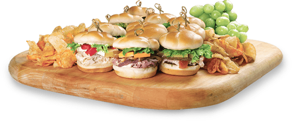 The Gourmet Sliders platter features roast beef & cheddar, turkey & brie, ham & manchego and grilled vegetables with feta & pesto. Served on mini brioche rolls.