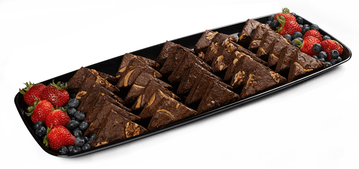 Dark chocolate, walnut and peanut butter brownies and served with fresh berries.