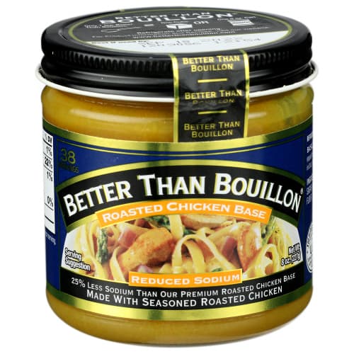 A granular paste containing roasted chicken combined with other flavoring materials. It conforms to all USDA requirements for chicken base and containing minimally processed ingredients. It contains reduced sodium levels. Use this in soups sauces gravies or to cook vegetables rice or pasta with more flavor.