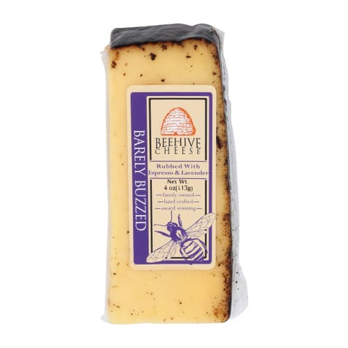 The blend consists of a mix of South American Central American and Indonesian beans roasted to different styles. French Superior Lavender buds are ground with the coffee and the mixture is diluted with oil to suspend the dry ingredients in the rub. The rub imparts notes of butterscotch and caramel which are prevalent near the rind but find their way to the center of the cheese. The cheese is aged on Utah Blue Spruce aging racks in Beehive Cheese Co's humidity controlled caves and moved to different temperatures during the four-month aging process to develop texture and flavor.