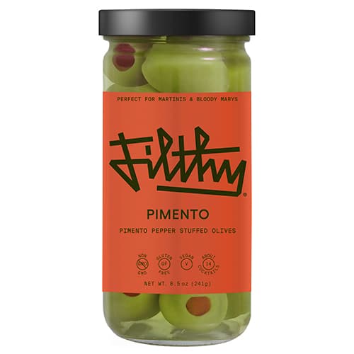 OUR HAND-SELECTED QUEEN OLIVES ARE STUFFED WITH THE SUCCULENT SWEET FLASH OF A HEART-SHAPED PIMENTO PEPPER. BATHED IN OUR UNIQUELY BLENDED FILTHY BRINE THE FASHIONABLY FITHY OLIVE COMPLEMENTS YOUR PREMIUM VODKA OR GIN-FILLED DRINK.