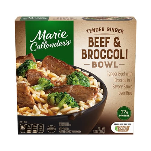Enjoy a big bowl of delicious with Marie Callender's Tender Ginger Beef & Broccoli Bowl. We take juicy USDA choice beef and tender broccoil florets and then mix in our made-from-scratch gravy created with ginger and garlic. Served over rice these delicious ingredients create the perfect savory meal. With 19 g protein no preservatives and no artificial colors or flavors this convenient microwavable bowl is comfort food at its best.