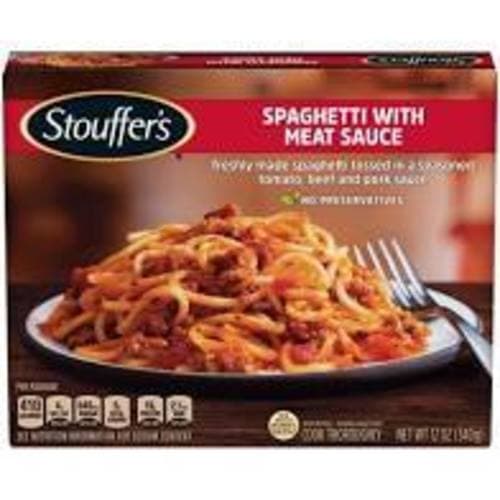 Stouffer's Spaghetti with Meat Sauce Frozen Meal offers a quick easy solution for lunch or dinner. The frozen dinners for one include freshly made spaghetti tossed in a seasoned tomato beef and pork sauce. This classic spaghetti dinner is sure to satisfy every taste bud. This frozen pasta meal contains 19 grams of protein per serving and contains no preservatives. Stouffers frozen spaghetti meals are easy to prepare in the microwave or oven making this spaghetti and meat sauce a great choice when you're short on time. Keep Stouffers spaghetti dinner in the freezer until you're ready to enjoy.