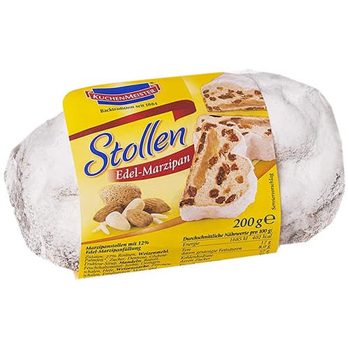sURPRISE THE mARZIPAN LOVER IN YOUR FAMILY WITH THIS DELICIOUS hOLIDAY sTOLLEN FROM kUCHENmEISTER. sOME OF THE THE CENTER. IS A REAL TREAT. eNJOY LOTS OF rAISINS cANDIED oRANGE AND BEST SPECIALTY PRODUCTS YOU CAN EXPECT FROM gERMANY IS MADE AND lEMON PEEL WITH A DELICIOUS mARZIPAN fILLING (10%) IN BY THE mASTERS AT kUCHENmEISTER AND THIS DELICIOUS sTOLLEN