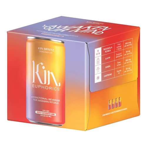 Untap good clean energy. Non-alcoholic and gently caffeinated Kin Spritz is infused with adaptogens nootropics and botanics like Rhodiola Rosea 5-HTP and Gaba to elevate your mood smooth out stress and offer a boost of energy. Tasting Notes: A sparkling herbaceous blend of bright ginger orange bitters hibiscus and citrus.