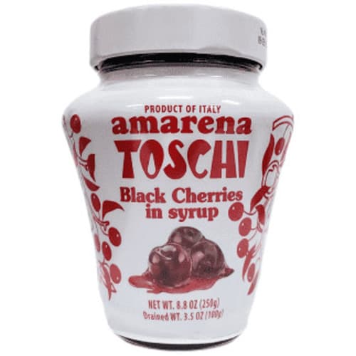 A CLASSIC TOPPING FOR ITALIAN GELATO CONSIDER THESE INTENSELY SWEET AND FLAVORFUL AMARENA CHERRIES AS THE GOURMET UPGRADE FROM MARASCHINOS. THE AMARENA IS A TYPE OF CHERRY WITH A SOUR AND REFRESHING TASTE THAT GROWS IN THE VIGNOLA AREA OF ITALY. IT IS A SUMMER FRUIT THAT IS RIPE FOR PICKING IN JULY. CAREFULLY SELECTED AND PITTED TOSCHI'S AMARENA CHERRIES ARE DIRECT FROM THE MOUNTIANS OF VIGNOLA. TODAY JUST AS SIXTY YEARS AGO THEY ARE SWEETENED AND READY TO GARNISH DESSERTS CAKES AND ICE CREAM AND TO EMBELLISH ICE-CREAM. THESE SWEET DELIGHTS ARE PERFECT TO GARNISH COCKTAILS ICE CREAM SMOOTHIES AND SLUSHIES. HERE YOU'LL FIND THEM PACKED IN A GLASS JAR WITH METAL LID.