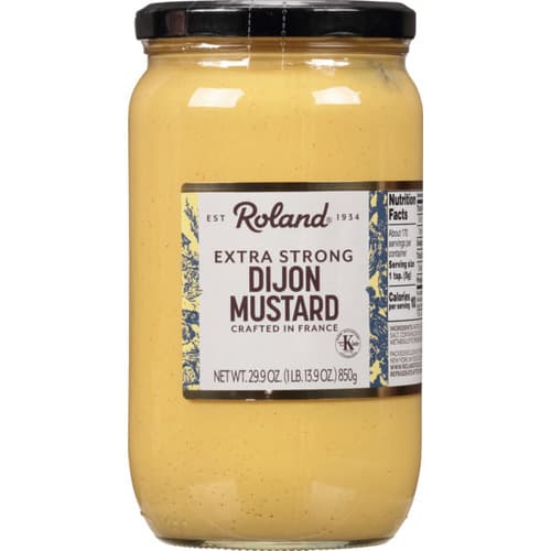 rOLAND eXTRA sTRONG dIJON mUSTARD IS PACKED UNDER fRENCH GOVERNMENT SUPER- VISION. iT IS PRODUCED FROM GROUND BLACK MUSTARD SEEDS WHICH GIVE IT A DEEP DARK YELLOW COLOR. tHE TEXTURE IS SMOOTH WITH NO GRITINESS. tHE FLAVOR IS STRONG YET WITHOUT THE HIGH ACIDITY OF DOMESTIC DIJONS