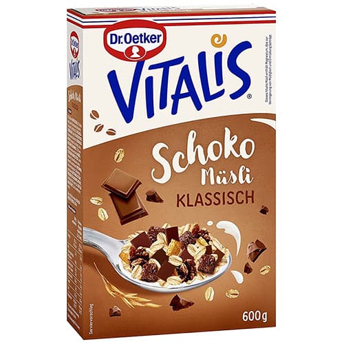 A lot of real whole milk chocolate makes Vitalis chocolate muesli a classic delight. With lots of tender oat flakes plenty of pops and almonds Vitalis chocolate muesli becomes a classic unmistakable chocolate treat. Vitalis chocolate muesli classic - start the day with full chocolate enjoyment!