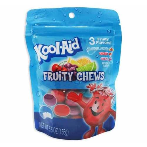 Take your childhood fruity favorite brand of Kool-Aid and get it in yummy candy goodness. Now in Fruity Chews in tropical punch cherry and grape flavors in each bag.