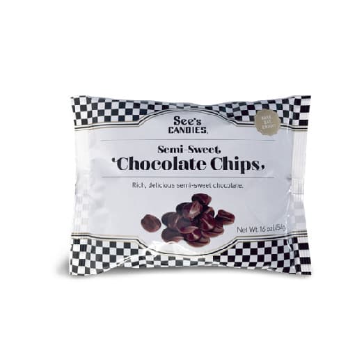 Love to bake? Then you will love See's Semi-Sweet Chocolate Chips. Our super-sized semi-sweet chocolate chips will make every kid (and kid at heart) smile when added to your favorite cookie recipe.