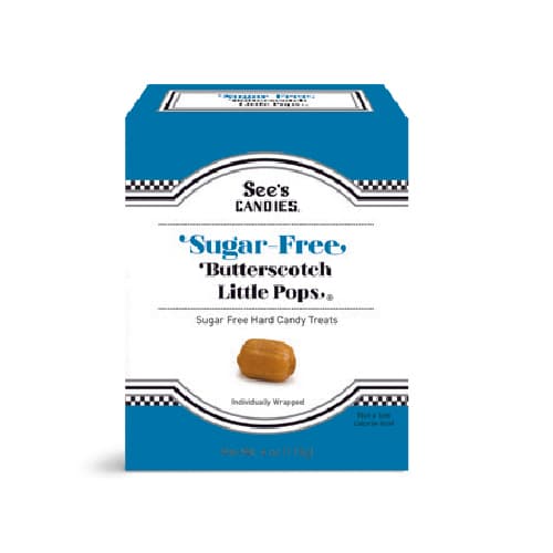 See's classic butterscotch flavor in a deliciously sugar free version! Our signature square long-lasting lollypop is a gourmet treat on a stick. Includes 8 individually wrapped lollypops per box.