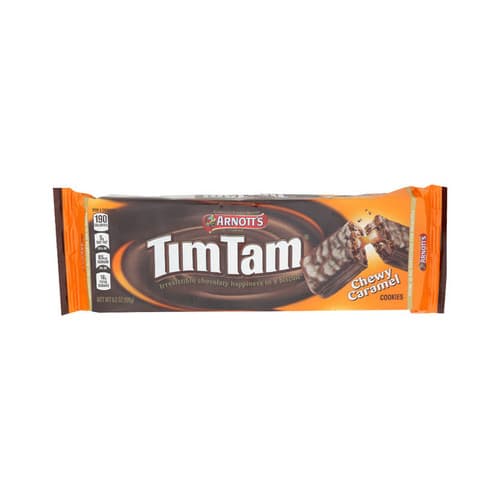 Arnotts Tim Tam Chewy Caramel biscuits are made with a mouth-watering combination of crunchy biscuit chewy caramel centre wrapped in a smooth chocolate coating . Its easy to see why Tim Tam is Australias most-loved chocolate biscuit. Find your moment of indulgence with Arnotts Tim Tam Chewy Caramel. Made with irresistible real chocolate and chewy caramel these biscuits are an iconic Aussie treat and the perfect way to indulge in the afternoon or unwind at the end of a long day. What more could you wish for?