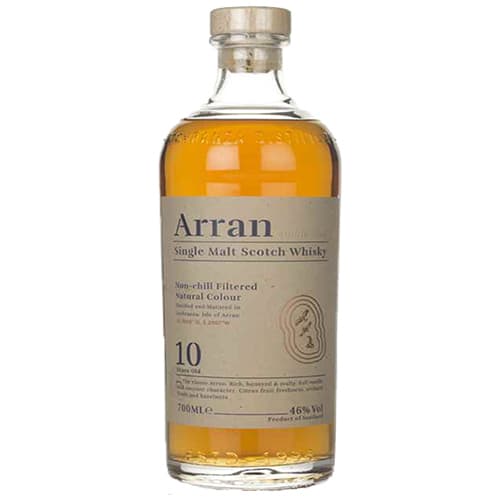 The classic expression of Arran - our fresh and unique island style is captured beautifully in our 10 Year Old Single Malt. First released in 2006 this is the flagship Single Malt of our distillery and one that we were very proud to launch to great acclaim. It is without a doubt a 'must have' in the collection of all Single Malt Whiskey enthusiasts. 46% ABV Tasting Notes: Color: Ripe Golden Barley Nose: The initial rush of rich vanilla sweetness gives way to the fruits of slow distillation - kiwi banana cantaloupe melon - with just a dusting of cocoa powder. It is undoubtedly complex and yet the aromas are in complete harmony with the malt. Palate: A touch of cinnamon adds a spicy edge to the soft and sweet texture which captivates the palate. The classic Arran citrus notes have rounded with age and reveal new depths of character against a background of sweet oak. Finish: It drifts over the tongue like golden syrup and fades ever so slowly to tempt another sip