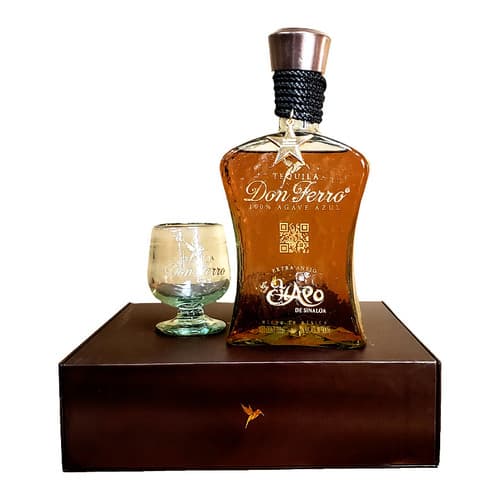 Don Ferro Extra Anejo Tequila Gift Set from El Chapo de Sinaloa. Limited edition box with glassware included. Made with 100 Agave Azul in Jalisco Mexico. Aged in American Oak barrels for at least 6 years. It is described by profound brilliant tone and complex flavor has notes of oak vanilla and caramel. It is produced using the blue Weber agave plant. It tastes smooth and is best appreciated slick or on the rocks. Don Ferro Extra Anejo Tequila is one of the best sipping tequilas around. From the finest 100 percent weber blue agave. 40% ABV.