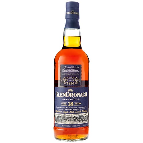 The GlenDronach 18 years old has been named after the renowned founder of the distillery James Allardice. This exceptional sherried single malt is non-chill filtered and of natural color. Matured in the finest Spanish Oloroso sherry casks and bottled at 46% this sublime richly sherried malt is truly unforgettable. 46% ABV Tasting Notes: Color: Bright deep gold with a tawny center. Nose: Sweet aromatics of fudge and Muscovado sugar. Fruit compote and glacier morello cherries provide added complexity. Palate: Rich dark and seductive. Remarkable flavors of stewed fruits and all-spice marry together with classic aged Oloroso sherry and toasted walnut bread combined with chocolate orange.Finish: Tremendously complex and long.