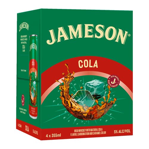 Jameson Cola in a can is a perfectly mixed combination of Irish Whiskey and natural Cola flavor in a convenient can to take where a glass bottle can't go. Our chilled can collection is inspired by favorite Jameson serves. Made with natural flavors and the perfect balance of Irish Whiskey the result is a fresh bubbly and consistent taste with the convenience to take on-the-go! Enjoy chilled from the can.