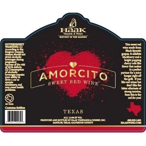 ''WINEMAKING Amorcito wine is made with grapes sourced from the highest quality south Texas vineyards. The grapes are fermented on their skins at 80F to get the maximum color and ripe fruit flavor. This wine is the true expression of the Texas Black Spanish Grape. Stainless Steel fermented and finished to produce a smooth finish with low tannins. FOOD PAIRING This wine is very food friendly and pairs great with a variety of dishes like Pizza Pasta dishes Fajitas Grilled veggies BBQ meats and Cheese plates. WINEMAKER'S COMMENTS This is a unique sweet red wine and it is designed to please a variety of palates. It is an easy going red with no oak aging. It has ripe and juicy flavors. Very rich with aromas of wild strawberries and sweet cherries. It can be served slightly chilled to bring out the bright red berry flavors. Amorcito means darling or sweetie in Spanish; it is the diminutive form of the affectionate term 'Amor'. So enjoy this beautiful wine with your loved ones!''